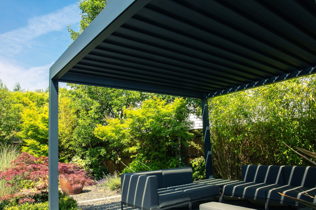 Rotate the louvers angled away from the sun for cooling shade beneath the structure